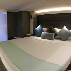 An interior spiral staircase leads up from the salon to the spectacular, fully covered fly-bridge lounge and bar. Enjoy the large, comfortable foredeck sunbeds with your favourite cocktail.